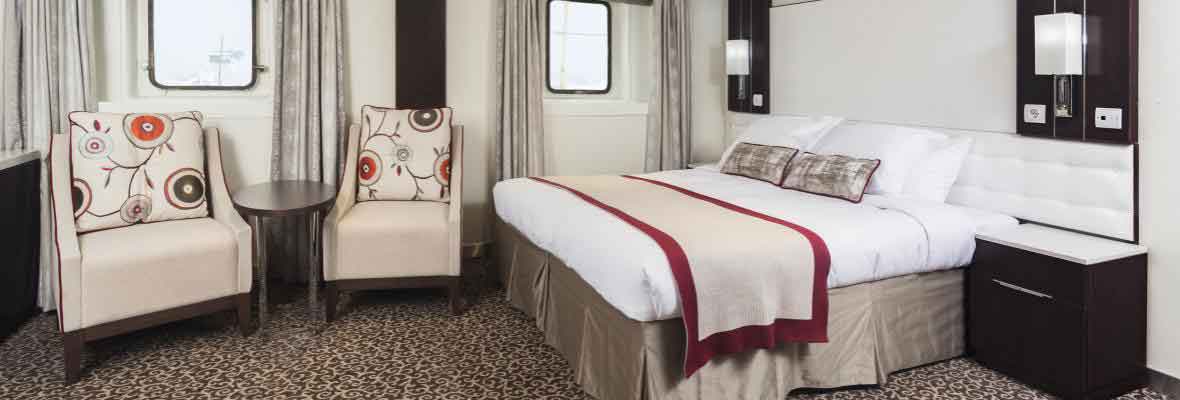 Zweibettkabine mit zwei Fenstern, Doppel- oder zwei Einzelbetten, Sitzgruppe, Bad mit Dusche/WC, ca. 19-24 m². Deck 5.
